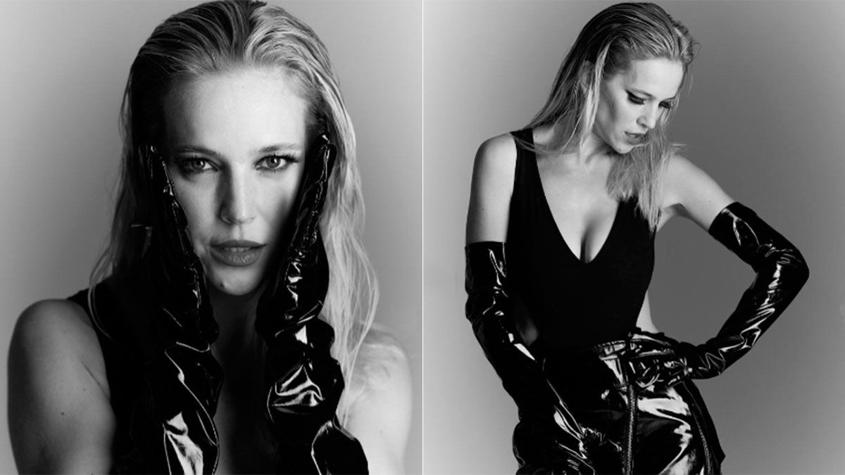La actriz impactó en redes sociales con una serie de imágenes en blanco y negro, donde luce un look total black de cuero.