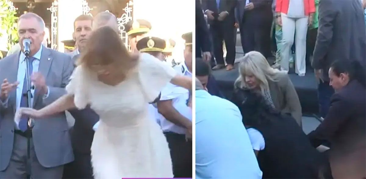 Rápidamente, la intendenta Rossana Chala y personal médico acudieron en su ayuda. Mientras tanto, el gobernador continuó con su mensaje: "El que usurpa comete un delito, debe ser juzgado y debe ser encerrado", afirmó, al tiempo que la funcionaria era asistida ante la mirada atónita de los presentes.