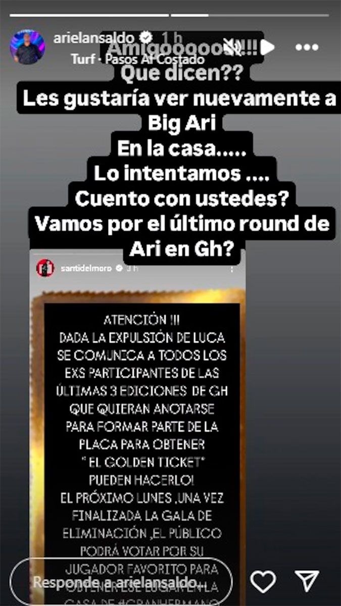 A medida que la noticia se expandió, otras exfiguras no tardaron en manifestar su interés por regresar al juego. Ariel Ansaldo, participante de hace tres años atrás, usó sus historias de Instagram para sondear la opinión del público con un mensaje directo: “¿Les gustaría ver nuevamente a Big Ari en la casa? ¿Vamos por el último round en GH?”.