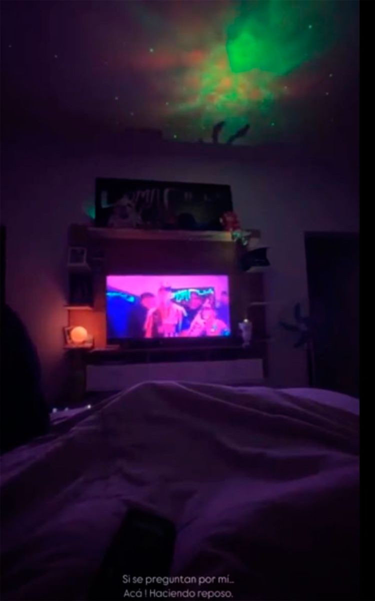 Desde la comodidad de su hogar, el referente de la cumbia 420 mostró cómo pasa sus días de reposo. A través de sus historias de Instagram, compartió una imagen tomada desde su cama, en la que se lo ve disfrutando de uno de sus videoclips en la televisión. Con luces tenues y un proyector de estrellas en el techo, el ambiente reflejaba un clima relajado, dejando en claro que, al menos por ahora, su prioridad es recuperarse.
