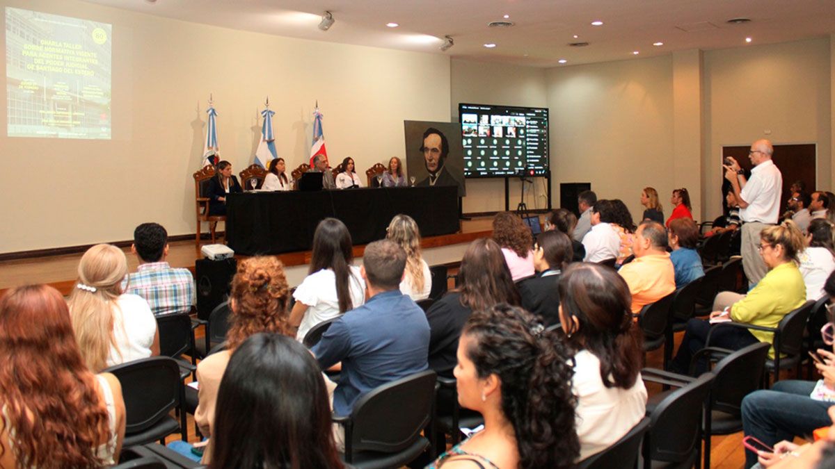 En la mañana del jueves tuvo lugar la charla taller sobre normativa vigente para integrantes del Poder Judicial de Santiago del Estero, actividad concretada en modalidad híbrida: presencial en el Salón de Usos Múltiples del Palacio de Tribunales y virtual para los agentes de los Centros Judiciales del interior provincial.
