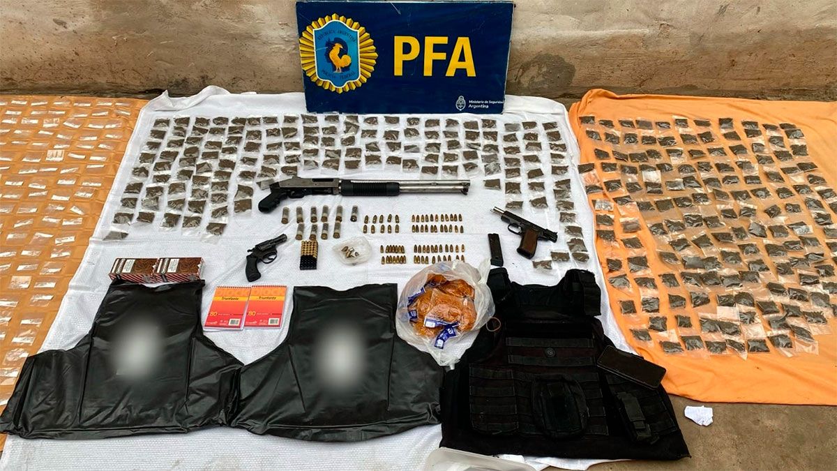 Durante las requisas, los federales incautaron 3.715 envoltorios de cocaína listos para su distribución, cuyo peso fue de 7,430 Kilogramos, 472 paquetes con siete kilos de marihuana, un chaleco antibalas, una escopeta, una pistola, un revólver 32 y cientos de municiones de diferentes calibres, entre otros elementos.