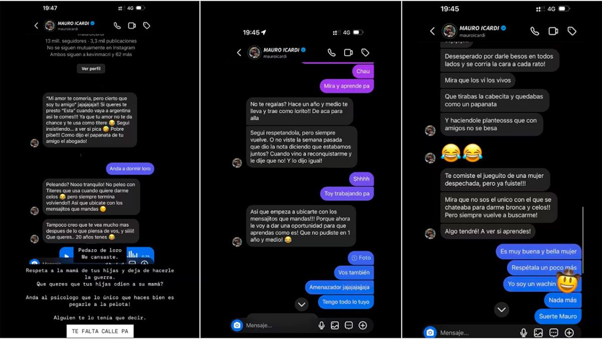 “Te comiste el jueguito de una mujer despechada, ¡pero ya fuiste! ¡Mirá que no sos el único con el que se chateaba para darme bronca y celos! ¡Pero siempre vuelve a buscarme! ¡Algo tendré! ¡A ver si aprendés!”, continuó Icardi, provocando que L-Gante salga en defensa de su pareja: “Es muy buena y bella mujer. Respétala un poco más. Yo soy un wachín. Nada más. Suerte, Mauro”.