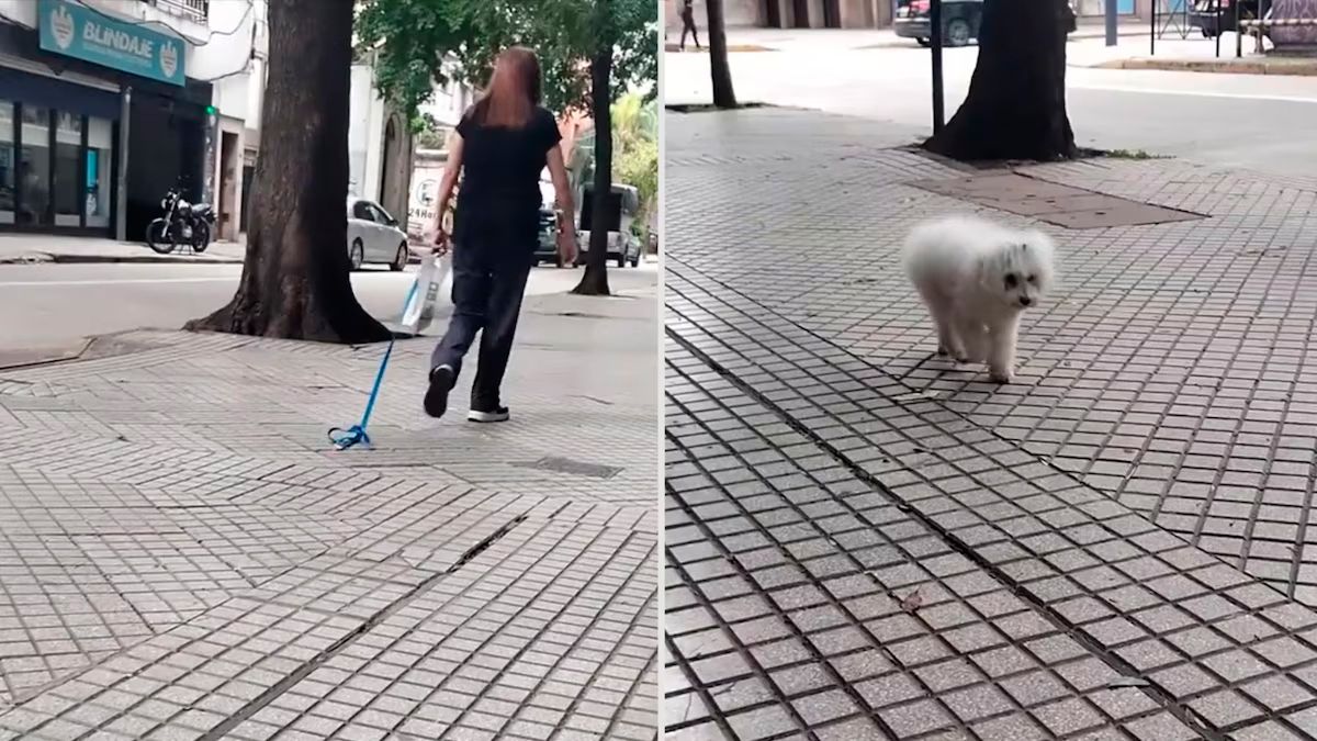 El clip, que dura apenas unos segundos, muestra a la mujer avanzando por la calle con la correa en la mano, mientras el perro, un pequeño caniche blanco, camina libremente detrás de ella.