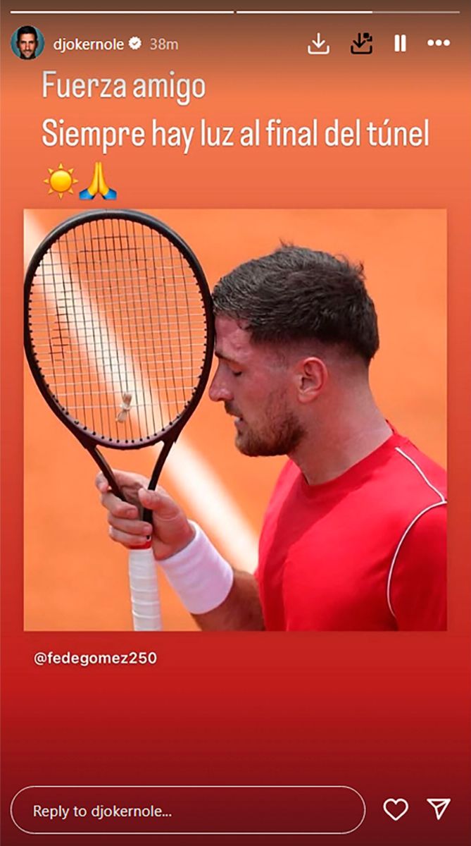 Su publicación generó una ola de apoyo en el circuito, y uno de los primeros en expresarse fue Novak Djokovic. El serbio, ex número uno del mundo, le dedicó un mensaje en español: “Fuerza amigo. Siempre hay luz al final del túnel”, acompañado de un sol y un emoji de rezo. No es la primera vez que Nole se involucra en temas de salud mental en el tenis, demostrando su empatía con los colegas que atraviesan momentos difíciles.