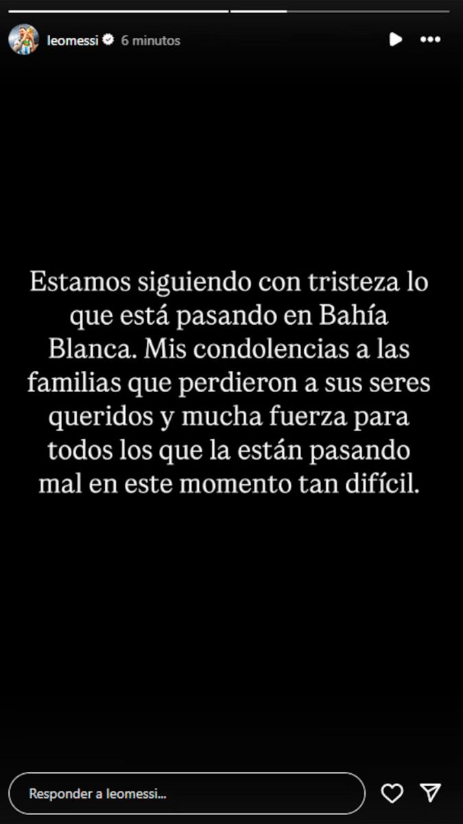 A pocos minutos de consumada la victoria de Inter Miami, que lo tuvo en el banco de suplentes, la Pulga utilizó su cuenta personal de Instagram, seguida por más de 500 millones de usuarios, para dedicarles un mensaje a las personas afectadas por el fenómeno climatológico: “Estamos siguiendo con tristeza lo que está pasando en Bahía Blanca. Mis condolencias a las familias que perdieron a sus seres queridos y mucha fuerza para todos los que la están pasando mal en este momento tan difícil”.