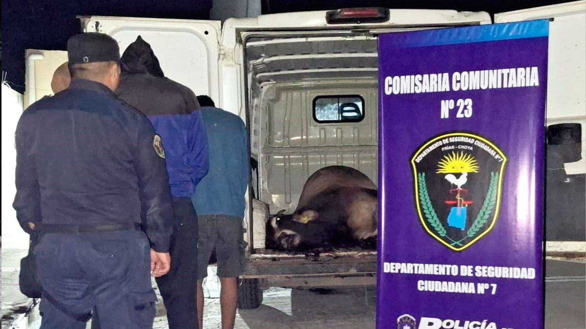 Durante el control, se descubrió que el vehículo transportaba un vacuno macho de aproximadamente 400 kg, que mostraba signos de haber sido herido con un arma punzante en el cuello y pecho, perdiendo sangre.