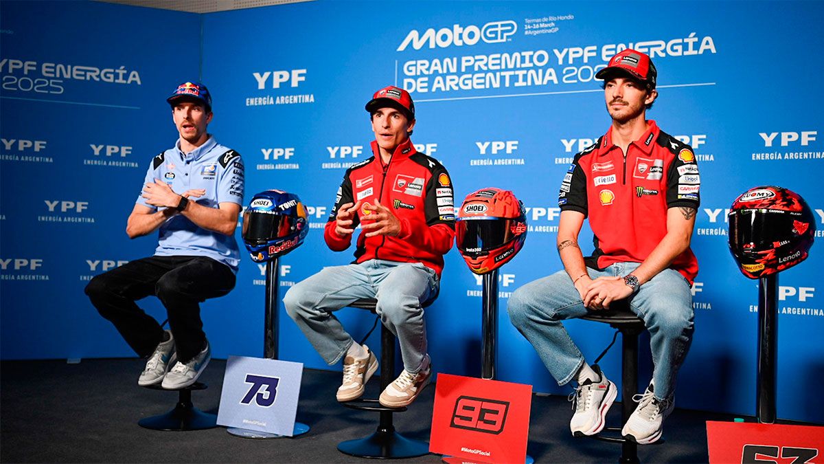 El piloto español Marc Márquez, de Ducati Lenovo Team, junto con Francesco Bagnaia, de Ducati Lenovo Team, y Alex Márquez de BK8 Gresini Racing MotoGP, ofrecieron este jueves una conferencia de prensa en la cual destacaron las condiciones del Circuito Internacional de Las Termas de Río Hondo y expresaron sus expectativas de cara al Gran Premio YPF Energía de la República Argentina que se disputará el domingo en la segunda fecha del Campeonato Mundial del Moto GP.