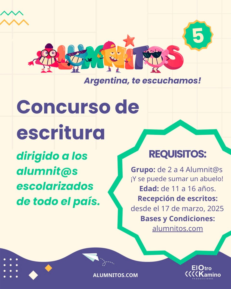 Bajo el lema "Argentina, te escuchamos!", la quinta edición del concurso de escritura Alumnitos ya está en marcha. Este certamen, dirigido a jóvenes de entre 11 y 16 años, cuenta además con la participación especial de los abuelos de todas partes del país, generando un espacio de intercambio intergeneracional a través de la palabra escrita.