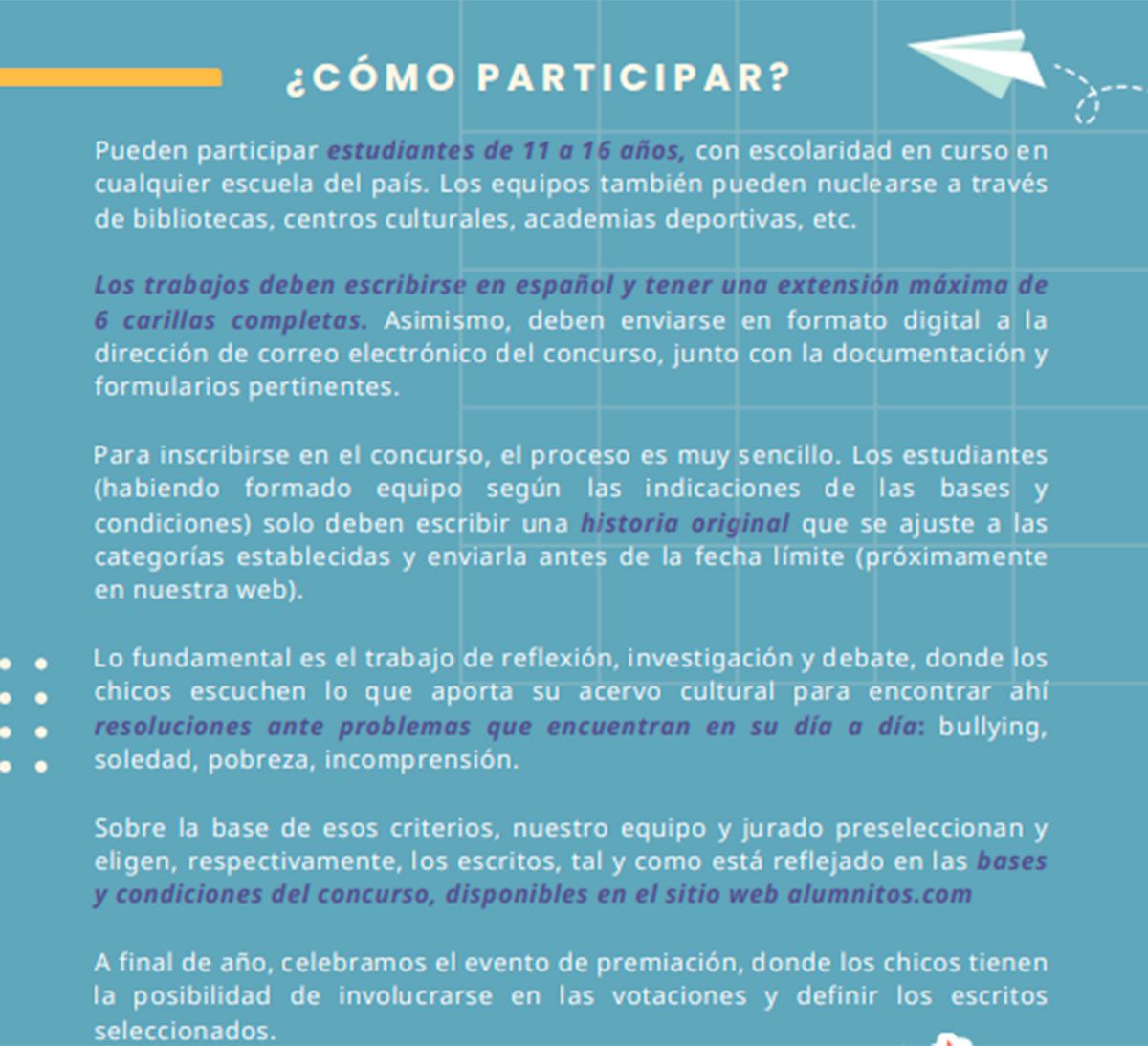 Este certamen, dirigido a jóvenes de entre 11 y 16 años, cuenta además con la participación especial de los abuelos de todas partes del país, generando un espacio de intercambio intergeneracional a través de la palabra escrita.