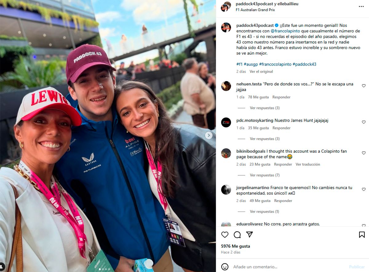 Luego, las conductoras compartieron el momento en redes sociales: "¡Qué momento tan genial! Nos topamos con Franco Colapinto, que casualmente lleva el 43 en la F1. Si no recuerdan el episodio del año pasado, elegimos el 43 para ponernos en la grilla, ya que nadie lo había tenido antes. Franco estuvo increíble y su nueva gorra le queda aún mejor", escribieron en Instagram.