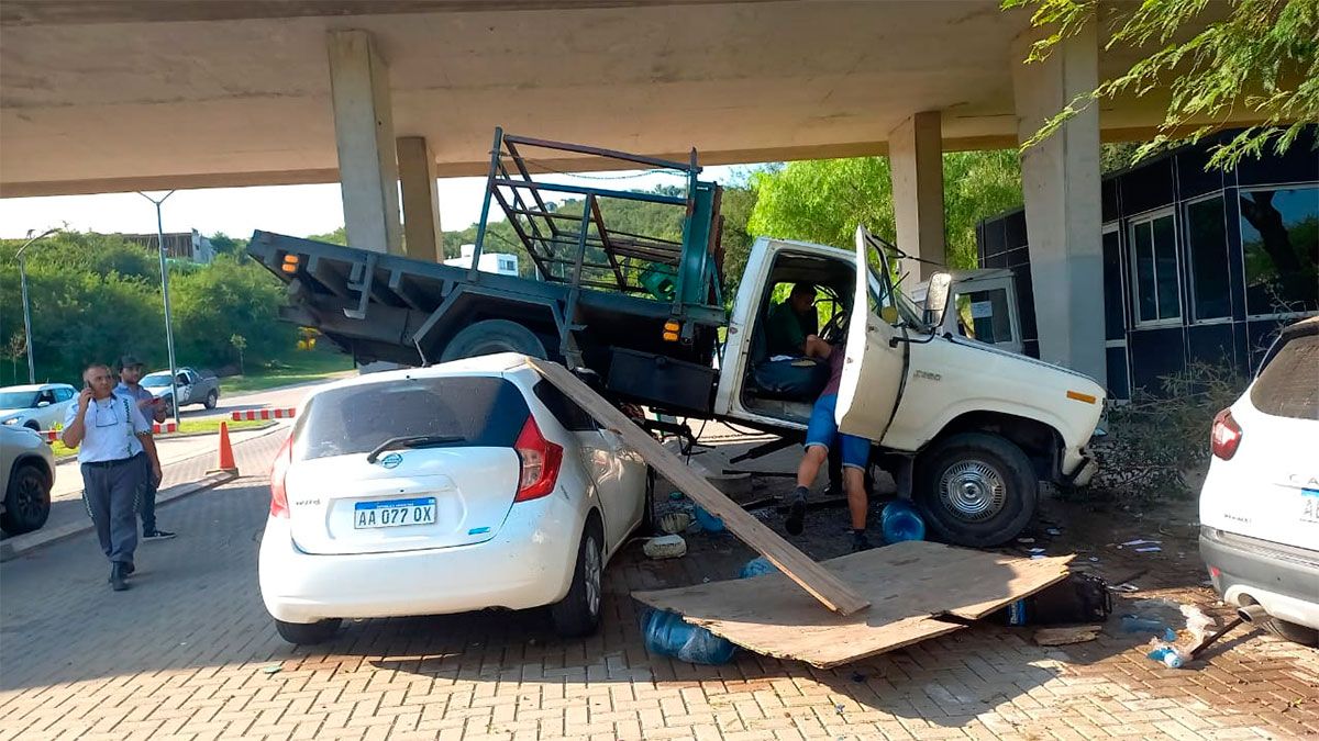 Un accidente inusual generó alarma ayer jueves por la mañana en el interior de un country privado de La Calera, en la provincia de Córdoba, cuando un camión con carga de agua y soda cayó desde un puente y terminó aplastando dos autos y una motocicleta que se encontraban estacionados en la parte inferior del predio.