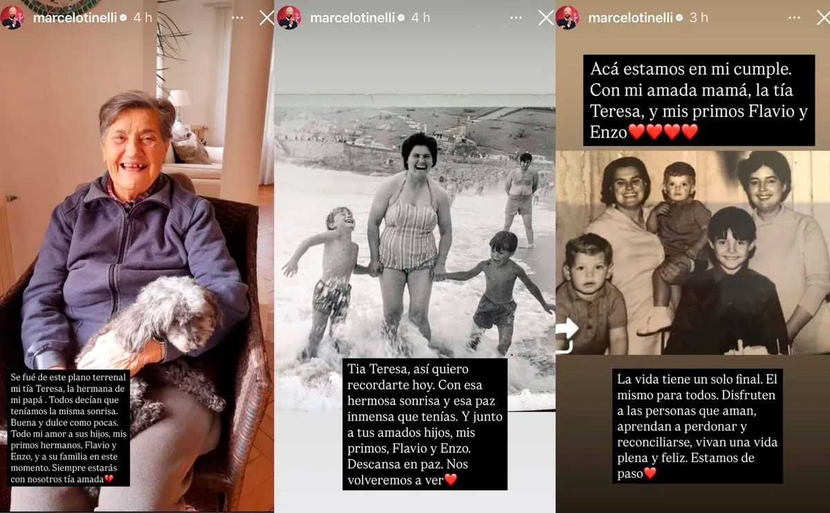 Habitual usuario de las redes sociales, en esta oportunidad Marcelo Tinelli usó sus Instagram Stories para expresar su profundo pesar por la reciente muerte de su tía Teresa, hermana de su papá. HACÉ CLICK AQUÍ PARA UNIRTE AL CANAL DE WHATSAPP DE DIARIO PANORAMA Y ESTAR SIEMPRE INFORMADO Así, el conductor no dudó en homenajear a su tía paterna a través de una serie de fotos con las que la despidió emocionado. “Se fue de este plano terrenal mi tía Teresa, la hermana de mi papá. Todos decían que teníamos la misma sonrisa. Buena y dulce como pocas. Todo mi amor a Flavio y Enzo, y a toda su familia en este momento. Siempre estarás con nosotros, tía amada”, apuntó sobre una postal actual de la señora sonriente con un perrito a upa. En tanto, minutos después posteó una fotografía en blanco y negro de Teresa en su juventud junto a sus hijos pequeños en la playa, a la que le escribió: “Así quiero recordarte hoy: con esa hermosa sonrisa y esa paz inmensa que tenías, junto a tus amados hijos. Descansá en paz. Nos volveremos a ver”. Además, para reflejar la cotidiana relación que siempre tuvieron, Marcelo Tinelli sumó una tercera imagen de él con su mamá, su tía y sus primos, en la que dejó un profundo mensaje: “La vida tiene un solo final. El mismo para todos. Disfruten a las personas que aman, aprendan a perdonar y reconciliarse, vivan una vida plena y feliz. Estamos de paso”. Por último, el conductor se despidió de sus seguidores deseándoles un hermoso sábado y agradeciendo el amor que recibe a diario, con una sentida reflexión: "La vida es ahora. Es no dejar nada para después. Es reír, llorar, sanar, reconstruir, crear, crecer, coincidir, conectar, empatizar y compartir. Es sentir, soñar, decir, demostrar, confiar, conocer, viajar, placer, y descubrir. Es abrazar, mirar, besar, disfrutar, cuidar y querer. Pero, por encima de todo, la vida es vivir. Así que hazlo lo más feliz que puedas. Y hazlo ya. Y siempre".