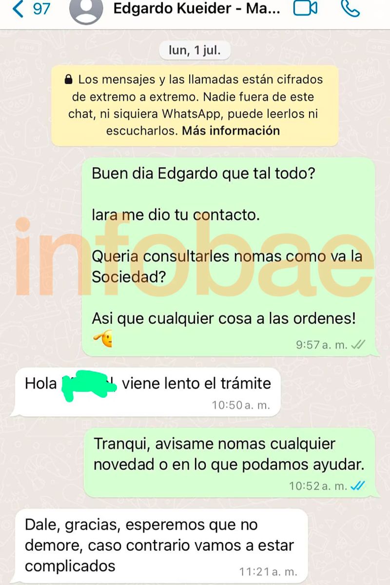 Guasti hasta aportó mensajes de WhatsApp enviados por la secretaria y por el ex senador (desde un teléfono de Estados Unidos). “Viene lento el trámite (de la sociedad”, avisó el ex senador el 1 de julio.