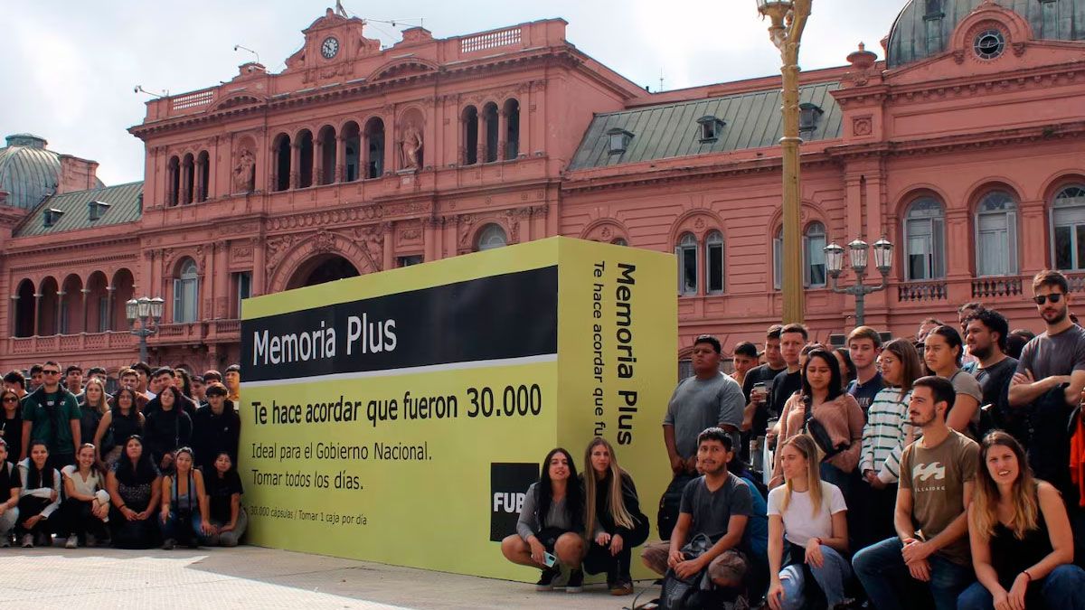 Estudiantes exhibieron una caja gigante de “remedios para la memoria” para denunciar el discurso oficial sobre los crímenes de la dictadura. La protesta se dio tras la difusión de un video gubernamental que relativiza la cifra de 30 mil desaparecidos.