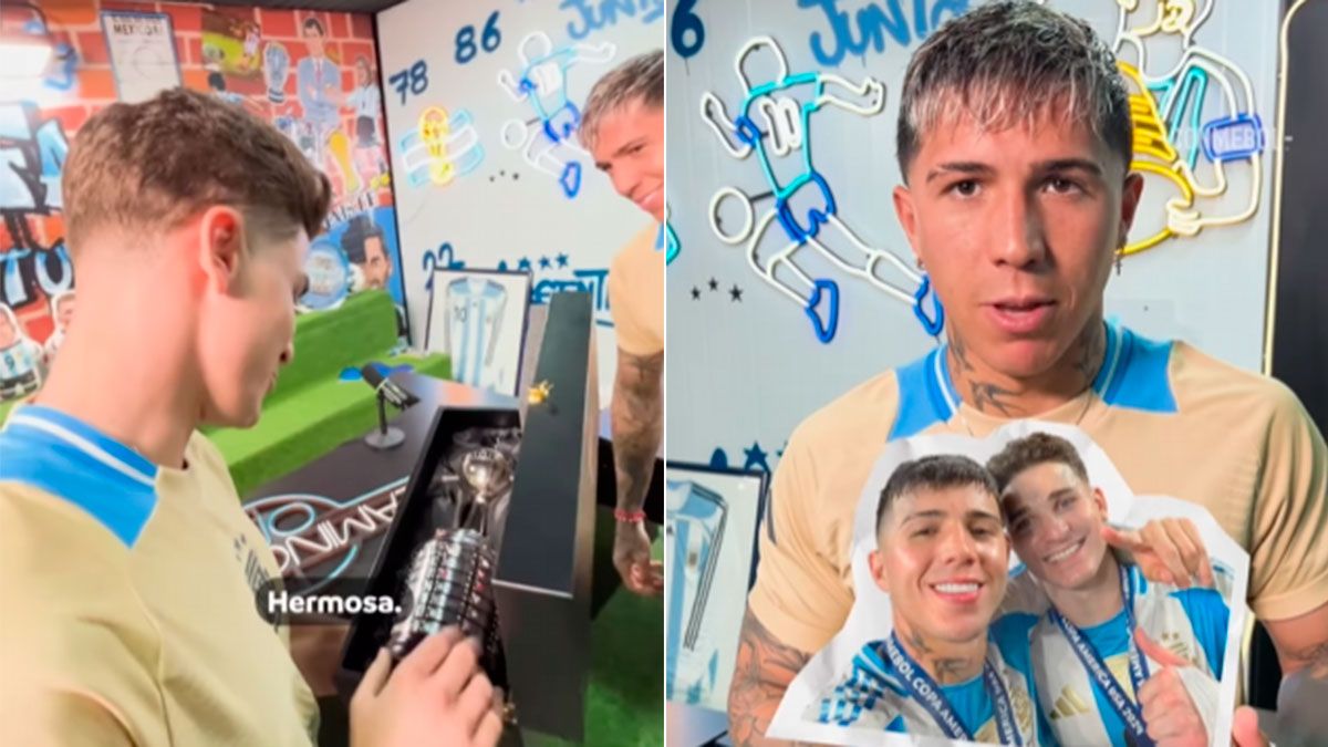 Más adelante, fue el turno de Julián Álvarez, quien recibió una réplica de la Copa Libertadores 2018, entregada por el propio Enzo. “Una locura, Madrid -sede de la final-. ¿Te acordás, no?”, le dijo Fernández en referencia a la recordada final en el estadio Santiago Bernabéu ante Boca Juniors.