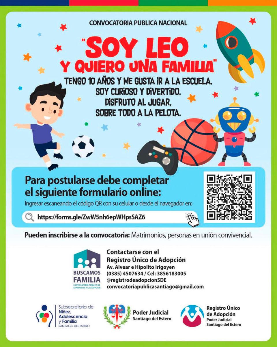 La Subsecretaría de Niñez, Adolescencia y Familia de Santiago del Estero lanzó una convocatoria pública para encontrar una familia para Leo, un niño de 10 años, alegre y divertido. Le gusta el fútbol, ir a la escuela y sueña con compartir su vida con una familia que lo cuide y lo acompañe en su crecimiento.