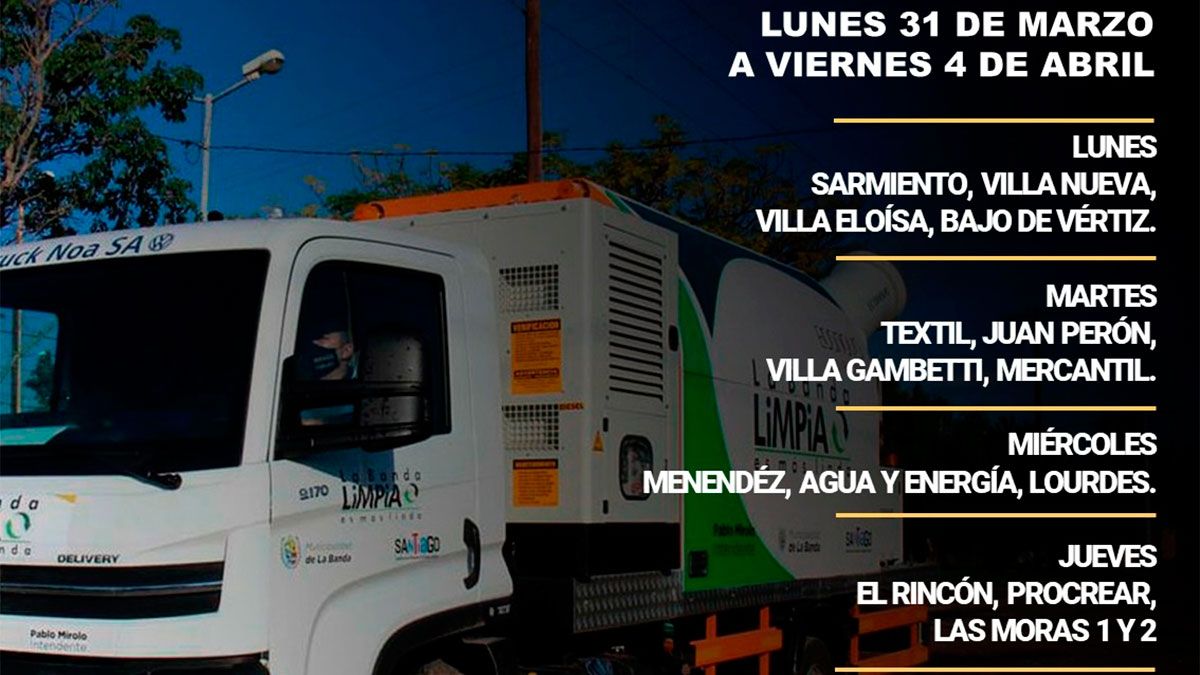 La Municipalidad de La Banda, a través de la Secretaría de Servicios Públicos, informa a la comunidad como será el cronograma de fumigación correspondiente a la semana del lunes 31 de marzo al viernes 4 de abril.