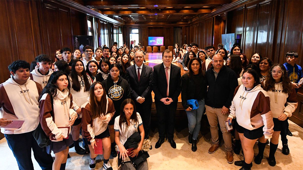 El gobernador Gerardo Zamora, acompañado por el jefe de Gabinete de Ministros, Elías Suárez, recibió este lunes en Casa de Gobierno la visita de 58 alumnos de quinto año de la Escuela de Comercio “General Martin de Güemes” de la ciudad de Sumampa, departamento Quebrachos.