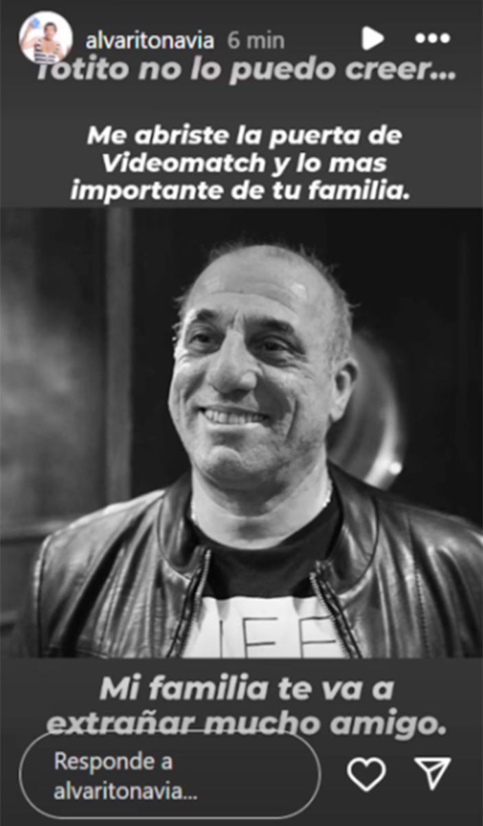 “Totito, no lo puedo creer. Me abriste la puerta de VideoMatch, y lo más importante: de tu familia”, escribió Álvaro Navia en sus redes. “Mi familia te va a extrañar mucho, amigo”, completó.