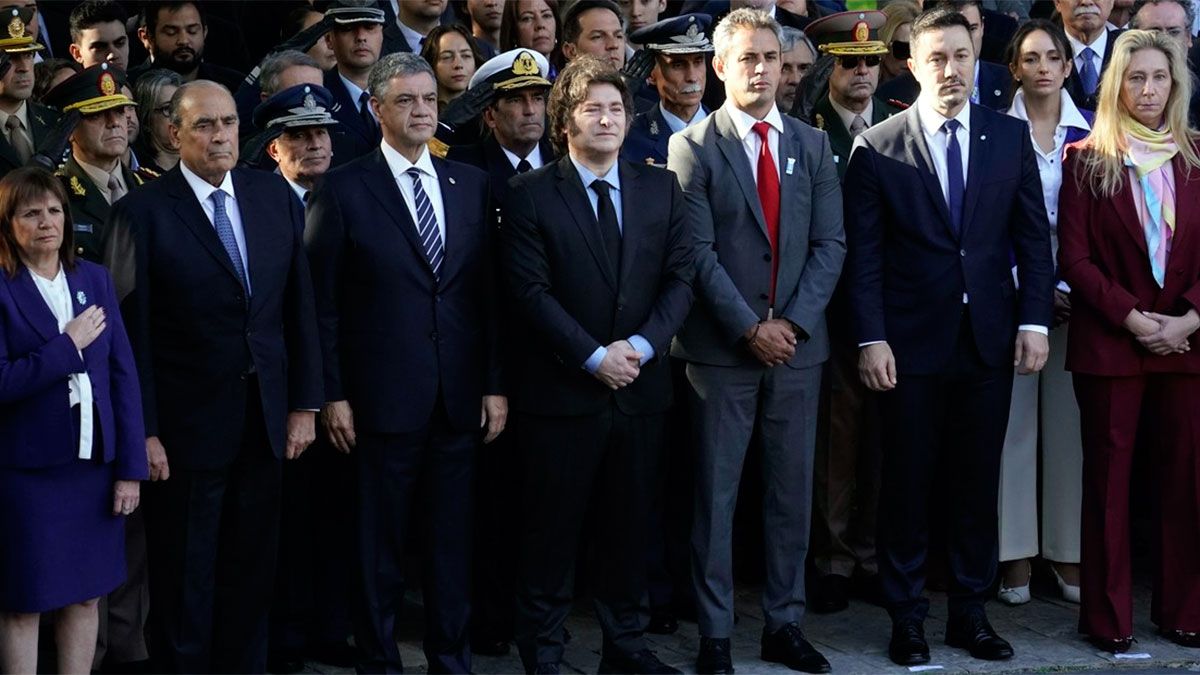 Al llegar, Milei atravesó un pasillo acompañado por su hermana, la secretaria general de la Presidencia, Karina Milei. Lo recibió el jefe de Gobierno porteño, Jorge Macri. Ambos, junto a una comitiva de funcionarios nacionales, primero realizaron un saludo en la placa del “soldado desconocido”. Después colocaron una ofrenda floral al pie del monumento a los héroes y se hizo un minuto de silencio.
