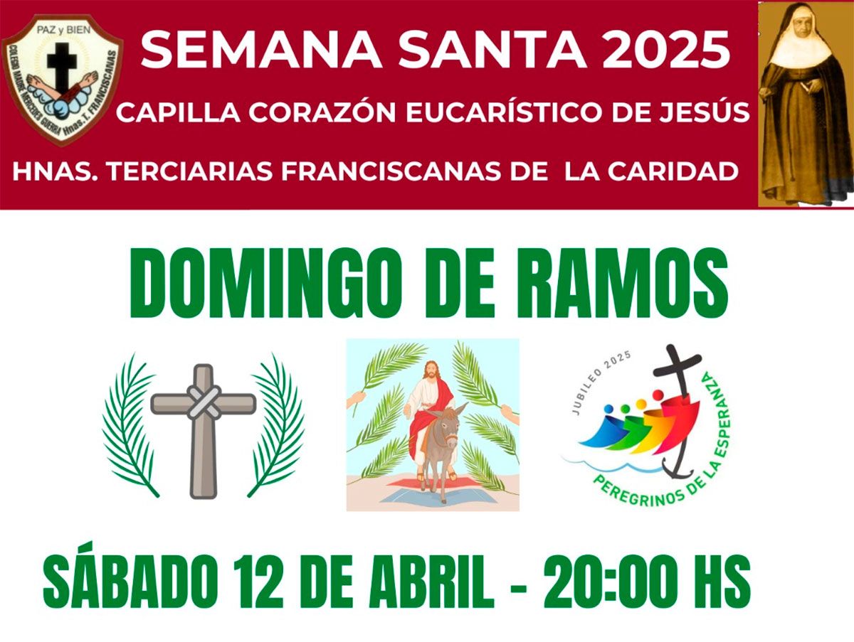 En el marco de las actividades por Semana Santa 2025, la Capilla Corazón Eucarístico de Jesús, perteneciente a las Hermanas Terciarias Franciscanas de la Caridad, invita a la comunidad a participar de la celebración del Domingo de Ramos.