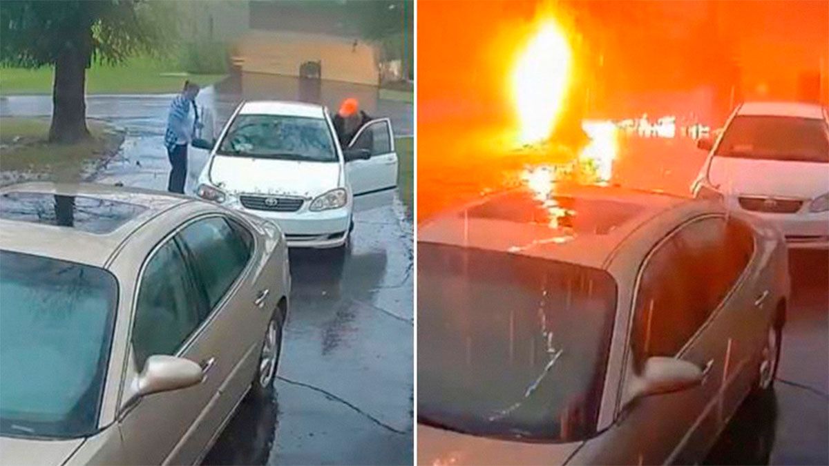 Una cámara de seguridad captó el momento aterrador en que una pareja escapó por poco de la muerte, al caer un rayo, segundos después de que entraran en su coche.