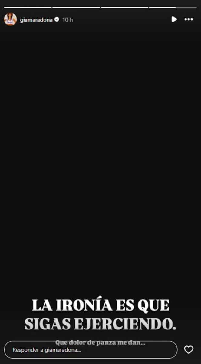 Ante esta situación, la hija del exfutbolista publicó una imagen negra con letras blancas en su cuenta de Instagram con el siguiente mensaje para Cosachov: “Ironía es que sigas ejerciendo. Qué dolor de panza me dan”.