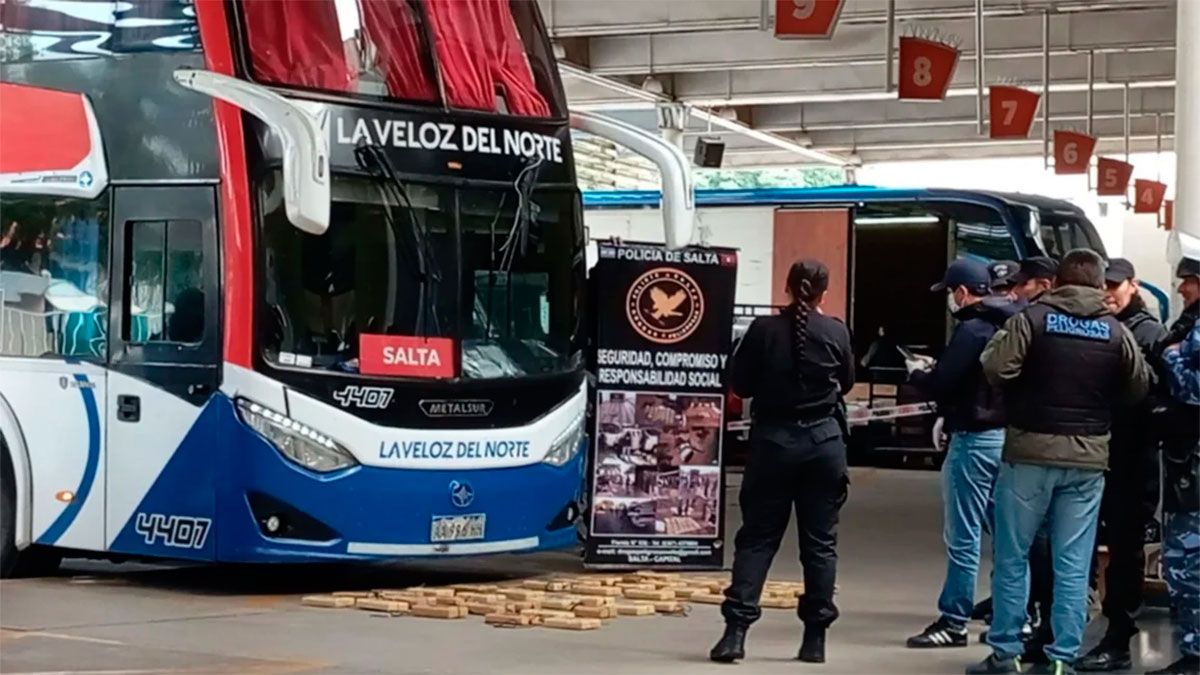 El operativo se desplegó de manera sorpresiva apenas la unidad de la empresa La Veloz del Norte estacionó en la dársena 10 de la Terminal de Ómnibus de la capital. Agentes policiales ingresaron rápidamente al predio, rodearon el colectivo y ordenaron el descenso inmediato de los pasajeros. Acto seguido, se dirigieron a la parte superior del vehículo de dos pisos y, tras revisar los extractores, extrajeron al menos 40 paquetes tipo "ladrillo" de color ocre.