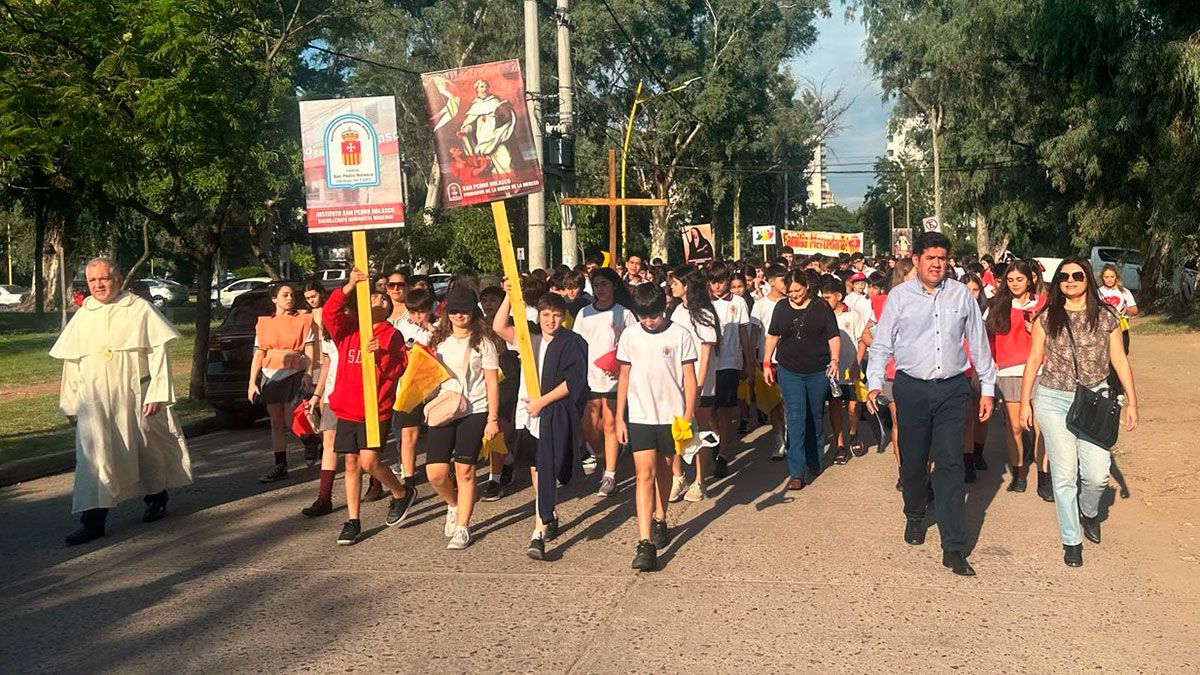 Acompañados por docentes, personal no docente, autoridades educativas y representantes de la Orden de la Merced, los estudiantes recorrieron las calles capitalinas hasta llegar al Domo Educativo. Allí representaron las estaciones del viacrucis, estableciendo un profundo paralelismo entre las tradicionales escenas bíblicas y las problemáticas actuales que afectan la fe y la dignidad humana en la sociedad argentina.