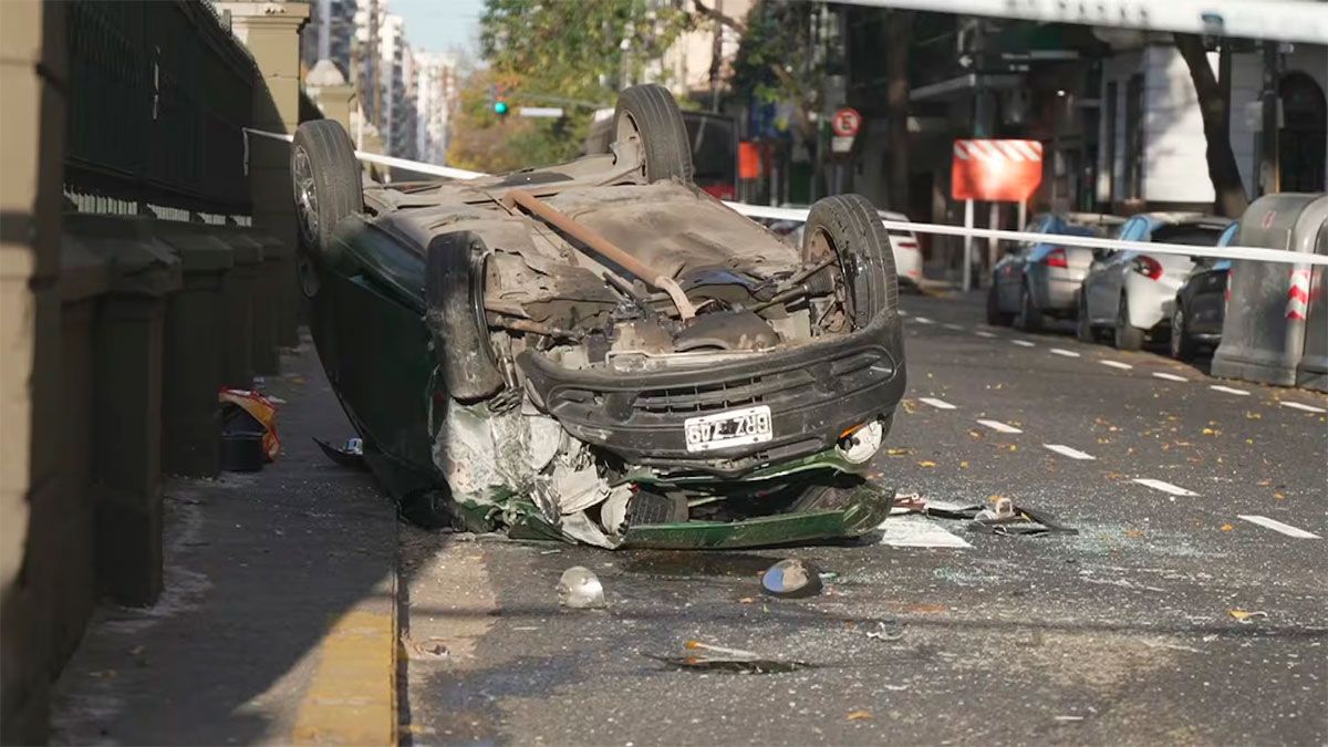 Un auto chocó contra un muro, impactó contra un colectivo y volcó este domingo a la madrugada, en el barrio porteño de Caballito.