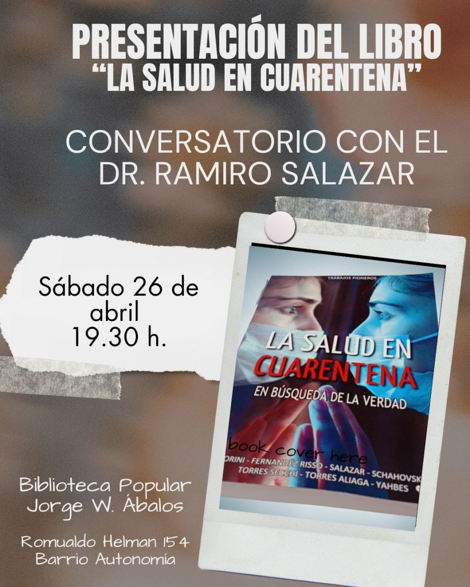 El sábado 26, a las 19.30 horas se presentará el libro La salud en cuarentena y se desarrollará un conversatorio con uno de sus autores, el médico Dr. Ramiro Salazar.