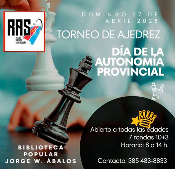 El día domingo 27 se llevará a cabo el Torneo de Ajedrez “Día de la Autonomía provincial” desde las 8 h. abierto a todas las edades. El mismo está auspiciado por la Red de Ajedrez Santiagueño y por el Taller de Ajedrez que dicta el profesor Rodrigo Roca.