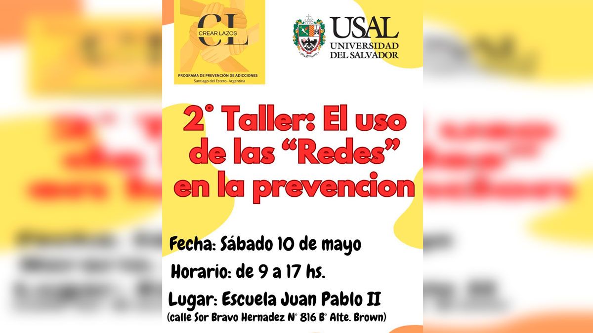El próximo sábado 10 de mayo se llevará a cabo el 2º Taller del Programa de Prevención de Adicciones "Crear Lazos", una iniciativa que busca fortalecer el rol de las redes sociales en la tarea preventiva.