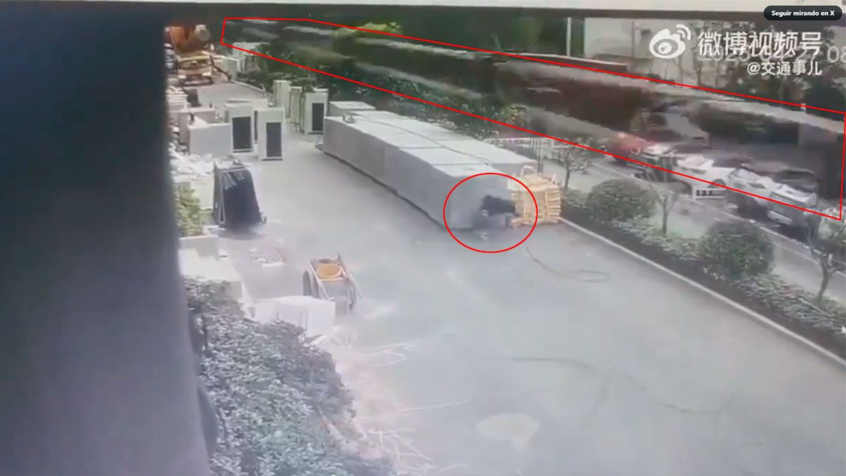 Las imágenes de una cámara de seguridad captaron el momento en que el obrero reacciona y se resguarda junto a una pila de bloques, tras darse cuenta de que una grúa que trabajaba en un piso 23 estaba a punto de caerle encima.