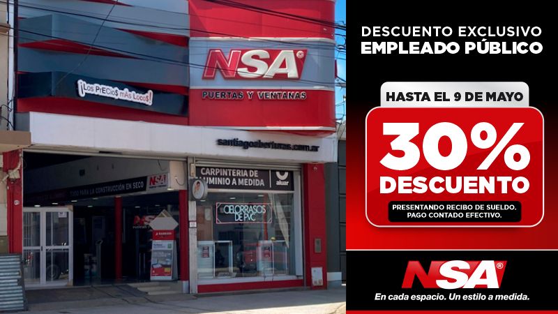 NSA Puertas y Ventanas lanzó una promoción imperdible para empleados públicos: 30% de descuento en todos sus productos abonando en efectivo. El beneficio está disponible durante diez días, hasta el 9 de mayo inclusive, en todas sus sucursales de Santiago del Estero.