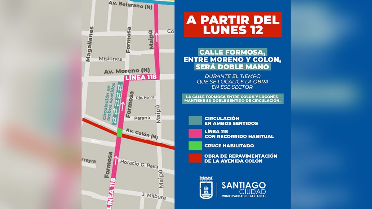 La Dirección de Tránsito y Transporte de la Municipalidad de la Capital informó que en virtud del avance de la obra de repavimentación de la Avenida Colón, se dispuso que a partir del lunes 12 de mayo, la calle Formosa tendrá un sentido de circulación de doble mano entre Avenida Moreno y Colón.