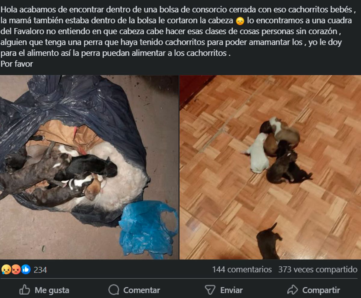 Para su horror, dentro de la bolsa encontró varios cachorros, pero lo más estremecedor del hallazgo fue descubrir que, junto a los animales, se encontraba la cabeza de la madre de los cachorros. La escena fue tan impactante que la usuaria no pudo evitar compartir su indignación en las redes sociales. "No entiendo en qué cabeza cabe hacer esas clases de cosas. Son personas sin corazón", expresó.