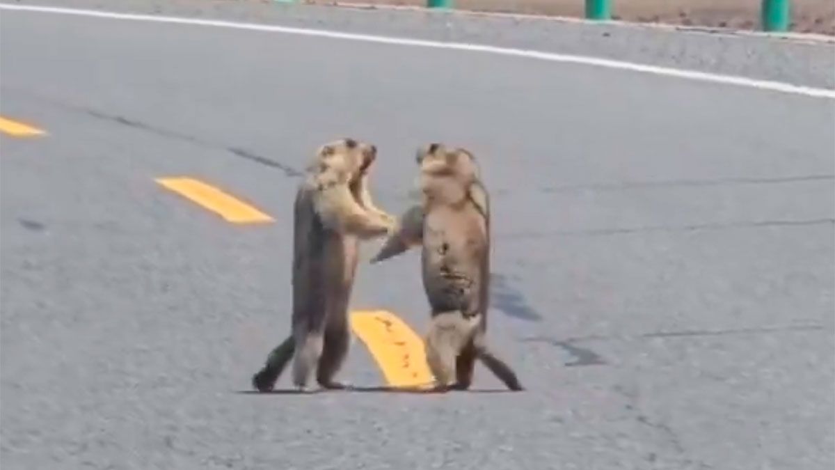 En la Red se ha viralizado un video en el que dos marmotas luchan erguidas sobre sus patas traseras en medio de una carretera de China, lo que detuvo el tráfico.