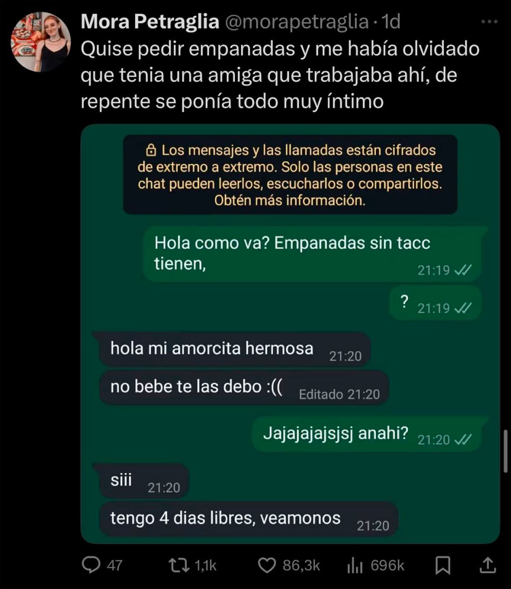 “Hola, ¿cómo va? ¿Empanadas sin TACC tienen?”, preguntó la chica con total naturalidad, buscando una opción libre de gluten. Sin embargo, la respuesta que recibió no fue la que esperaba: “Hola mi amorcita hermosa. No, bebé. Te las debo”.