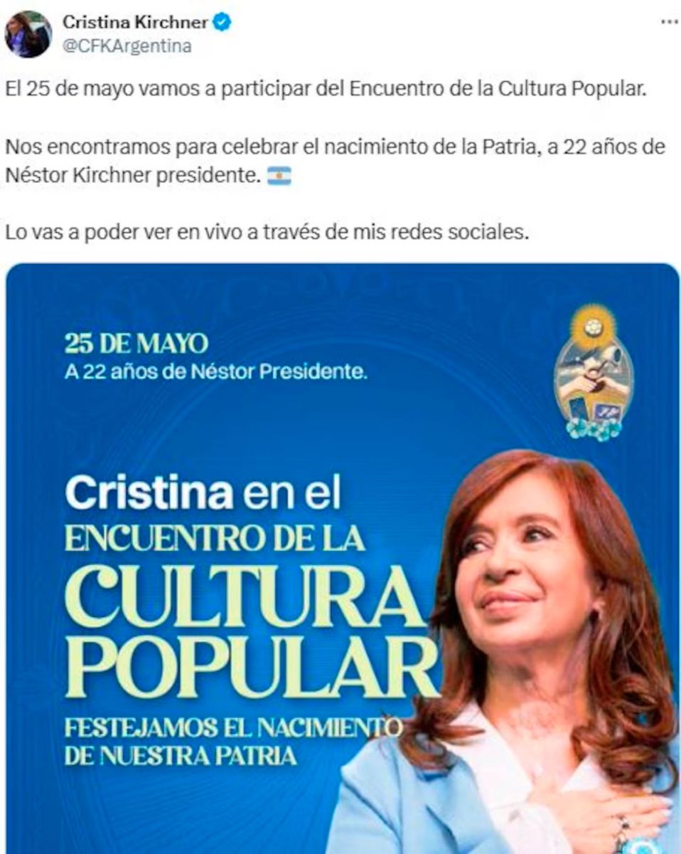 La exmandataria participará de un Encuentro de la Cultura Popular el próximo 25 de mayo en un centro cultural en Retiro. La fecha patria tiene una doble connotación para el kirchnerismo: se cumplen 22 años de la asunción de Néstor Kirchner como presidente.