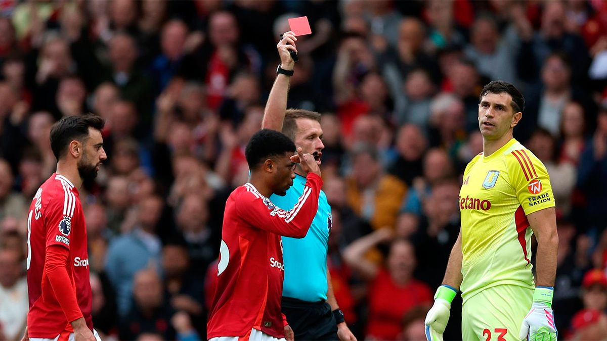 El arquero argentino Emiliano Martínez fue expulsado por primera vez en su carrera, tras salir muy lejos de su área e interrumpir con un fuerte topetazo la corrida del delantero danés Rasmus Højlund, en la derrota 2-0 de Aston Villa ante Manchester United en Old Trafford, que lo dejó sin Champions League para la próxima temporada.
