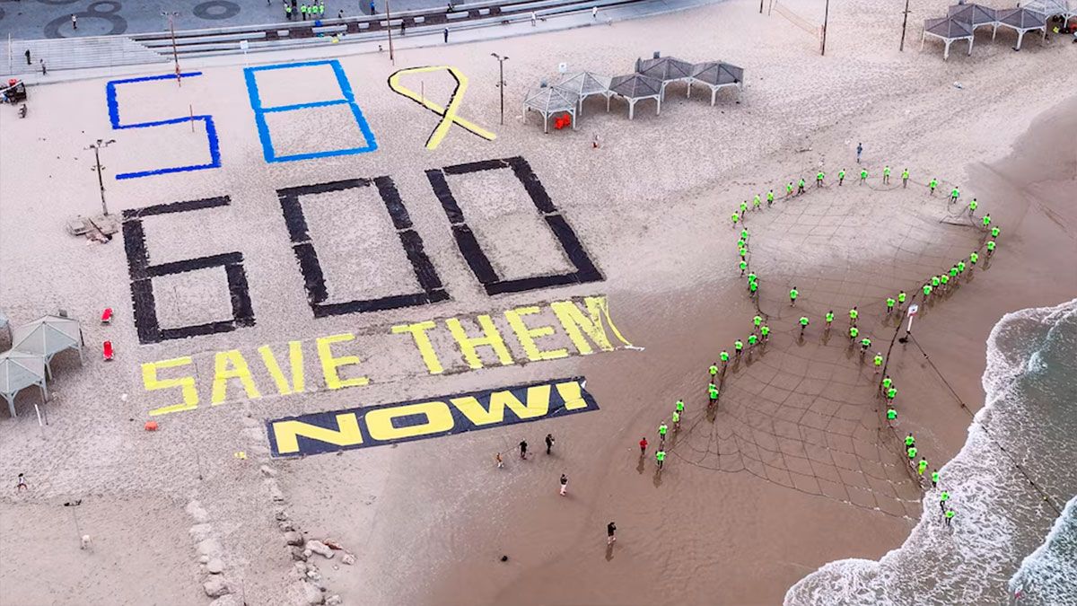 Desde drones, se registró una coreografía silenciosa en la arena: decenas de activistas formaron un lazo amarillo, símbolo del cautiverio, junto a carteles gigantes con las inscripciones “58”, por el número de rehenes israelíes que aún siguen en Gaza, y “600 ¡SÁLVENLOS AHORA!”, en alusión a los días transcurridos desde el ataque del 7 de octubre de 2023.