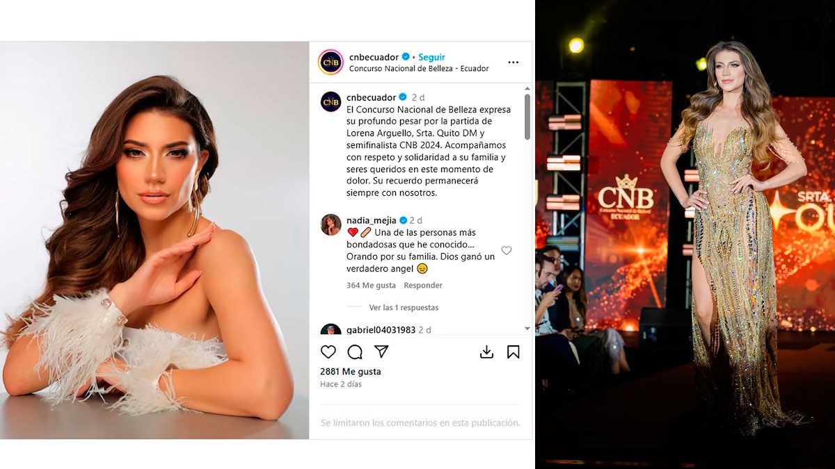 “El Concurso Nacional de Belleza expresa su profundo pesar por la partida de Lorena Argüello, Srta. Quito DM y semifinalista CNB 2024. Acompañamos con respeto y solidaridad a su familia y seres queridos en este momento de dolor. Su recuerdo permanecerá siempre con nosotros“, comunicaron en la red social.