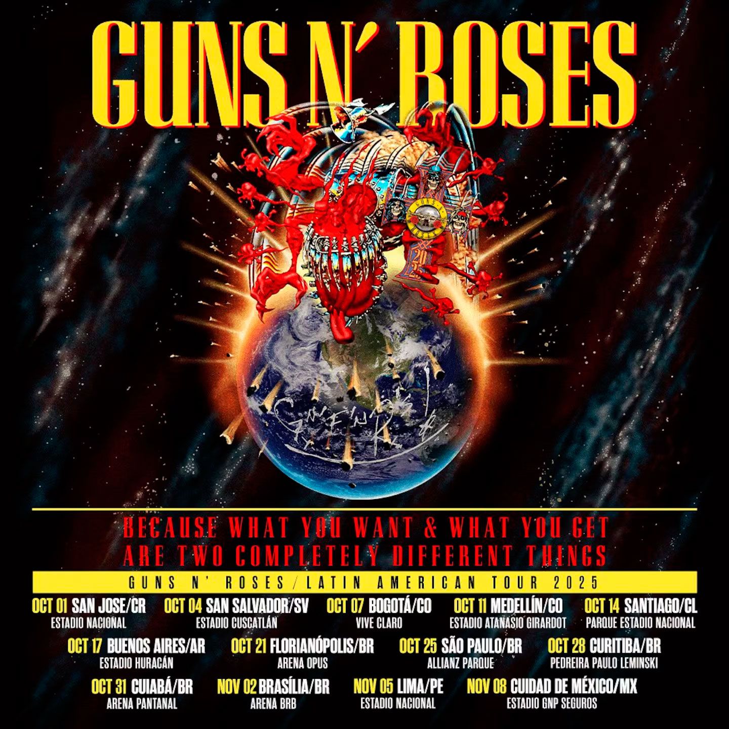 Guns N’ Roses regresa a la Argentina en octubre como parte de su ambiciosa gira mundial 2025, titulada Because What You Want & What You Get Are Two Completely Different Things (Porque lo que quieres y lo que consigues son dos cosas completamente diferentes).