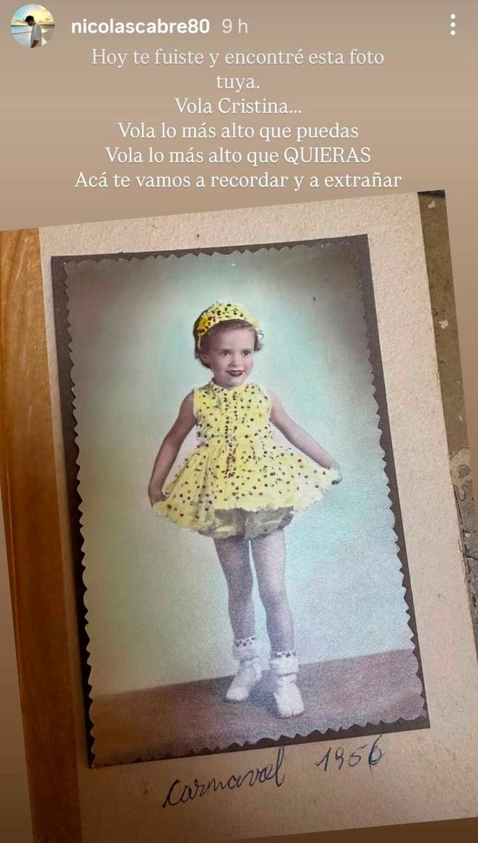 “Hoy te fuiste y encontré esta foto tuya. Volá alto Cristina. Volá lo más alto que puedas. Volá lo más alto que quieras. Acá te vamos a recordar y extrañar”, expresó el actor, que no quiso dar detalles del deceso.