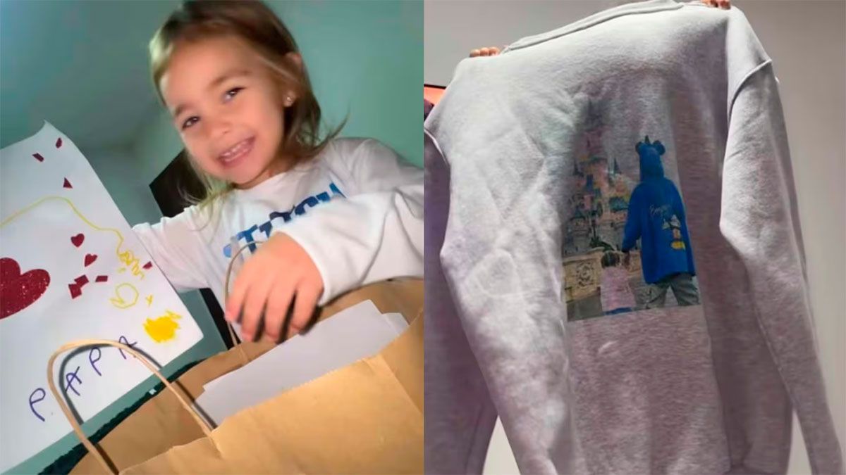 En el clip, la pequeña aparece sacando de una bolsa de papel madera un buzo gris personalizado y varios dibujos hechos por ella misma, que luego entregaría a su papá. Entre los diseños se pueden ver corazones, mariposas y stickers, todo con una impronta infantil y afectuosa.