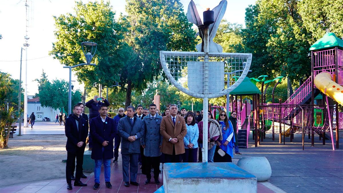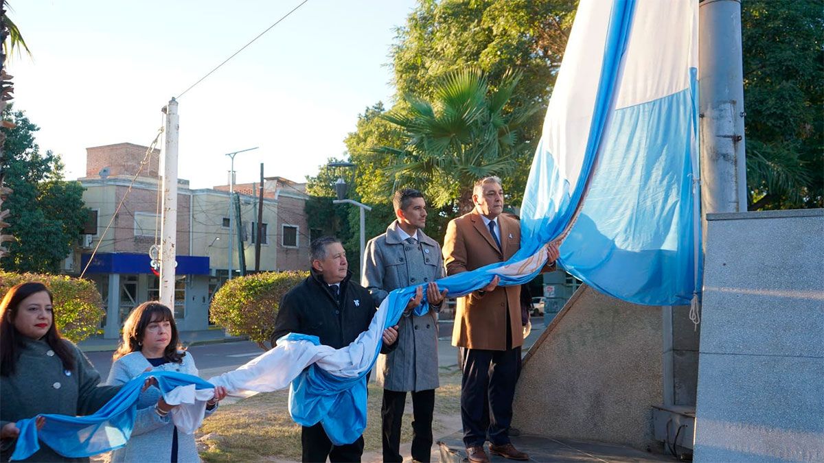 Los actos de la jornada comenzaron a la mañana con el izamiento de bandera en el mástil de la plaza Manuel Belgrano, la colocación de ofrendas florales en el busto del prócer y el encendido de la llama votiva en memoria de Monseñor Gerardo Sueldo.