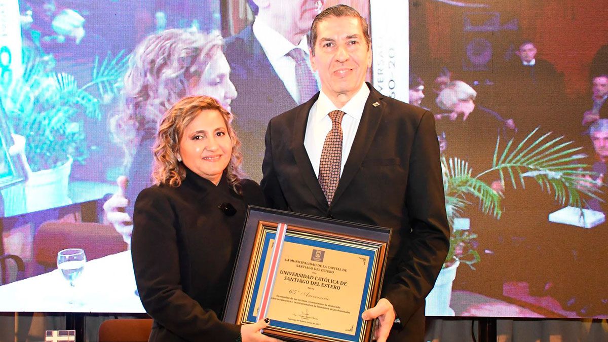 Durante la ceremonia, la jefa comunal hizo entrega en representación de la Municipalidad de la Capital, de una plaqueta recordatoria al rector, destacando la trayectoria institucional de la UCSE y su servicio permanente en la formación de profesionales.