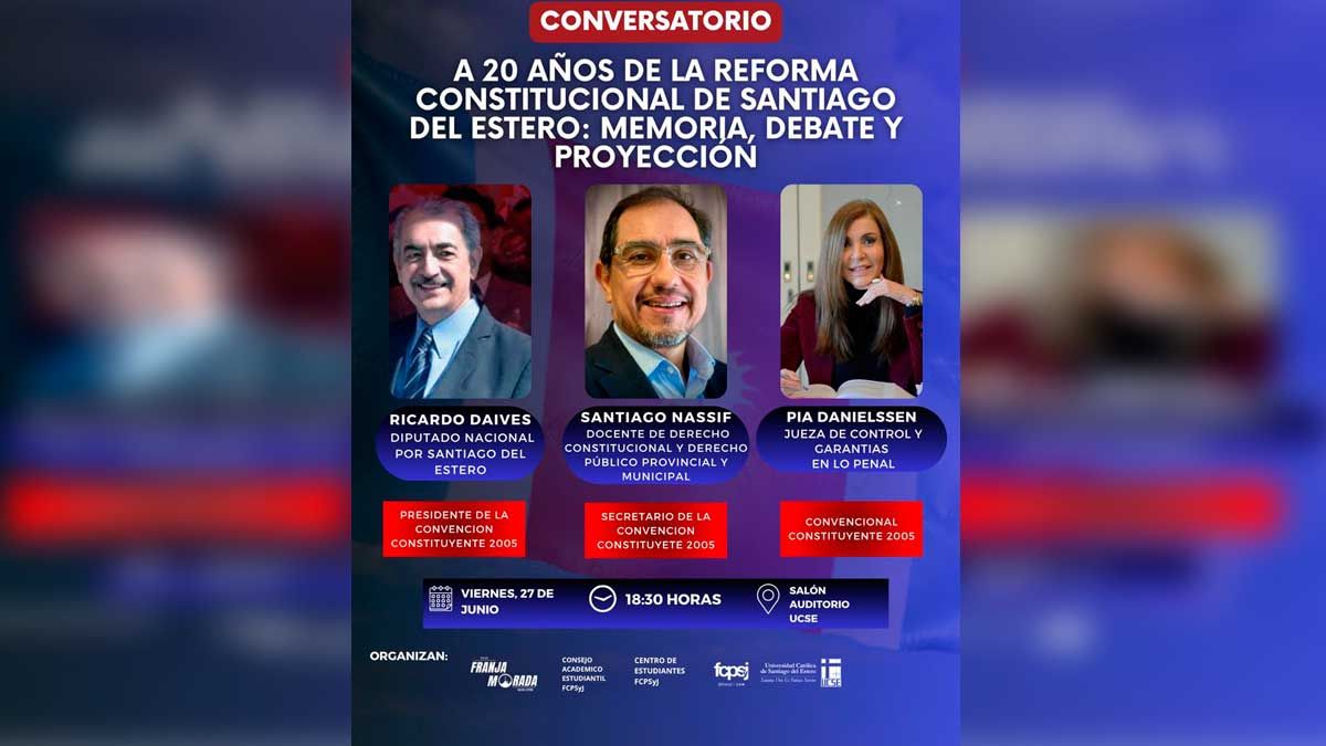 Este viernes 27 de junio a las 18.30 horas se realizará un conversatorio especial en el Salón Auditorio de la Universidad Católica de Santiago del Estero (UCSE) para conmemorar los 20 años de la última reforma constitucional de la provincia.
